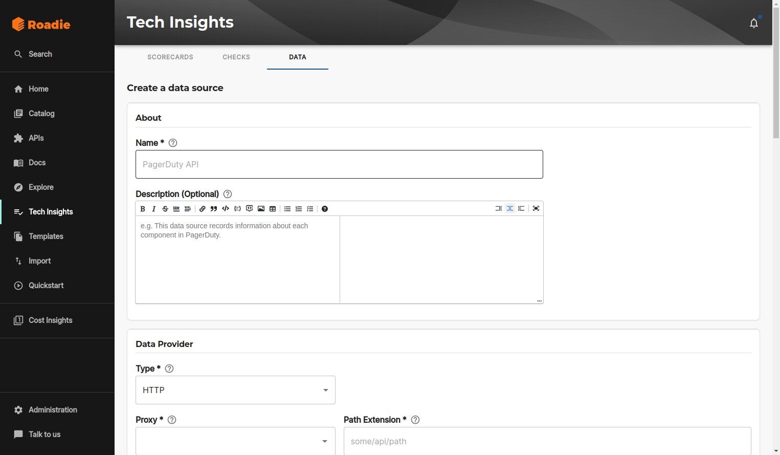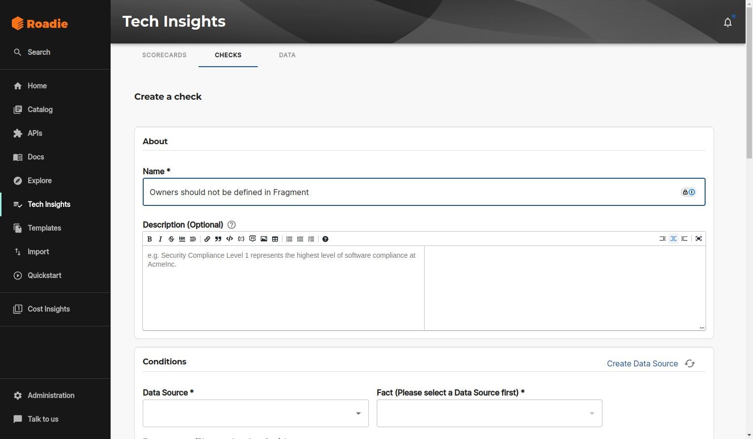 6. Click the "Description (Optional)" field. Type "Imports fragments data from the catalog entities which can be used to create Tech Insights checks."