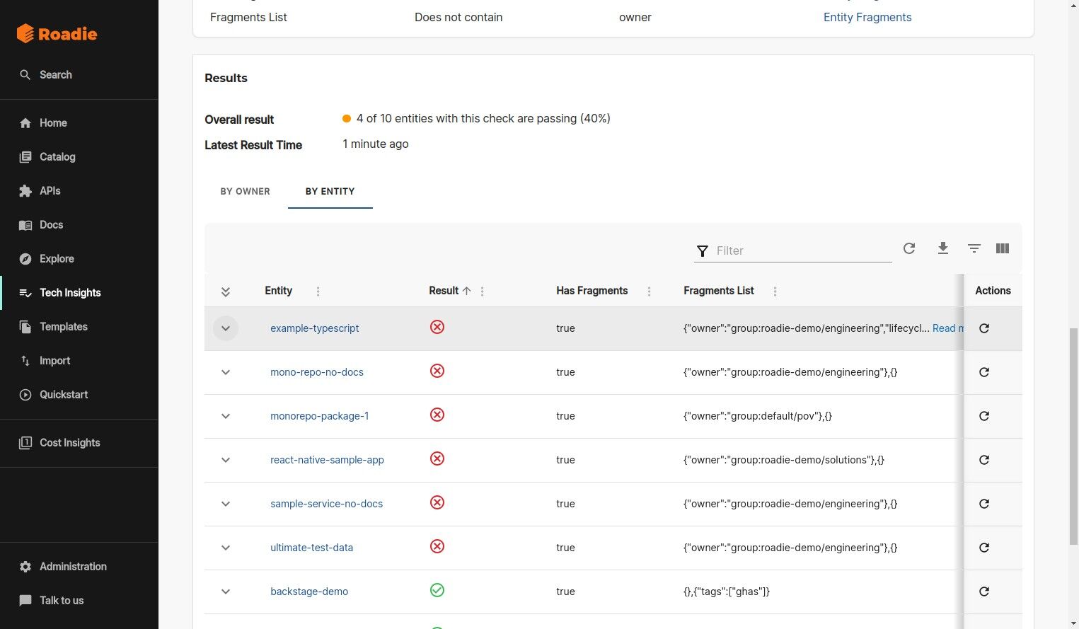 - Automatically scan entities in the Backstage catalog and record the fragments associated with them.